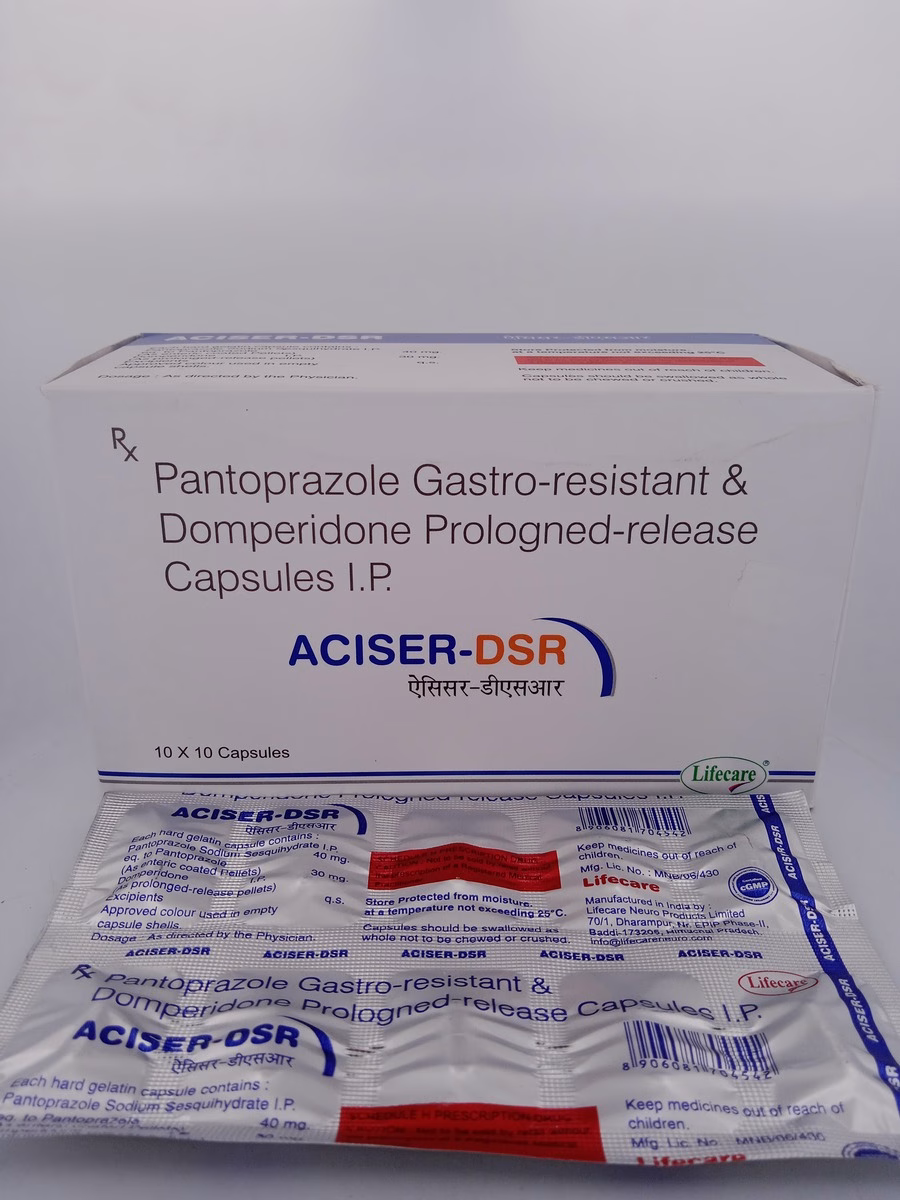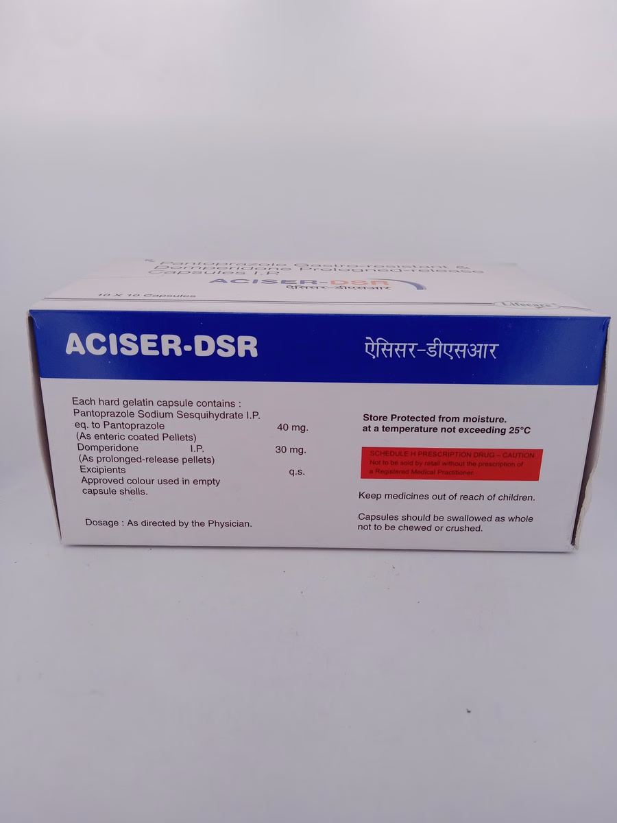 ACISER-DSR is designed to combat both gastroesophageal reflux disease (GERD) and indigestion. Domperidone helps improve gastric motility, making digestion smoother, while Pantoprazole works by reducing stomach acid, effectively relieving acid reflux, heartburn, and other symptoms of GERD. Regular use can significantly improve comfort and digestion, preventing acid buildup and ensuring long-term relief.