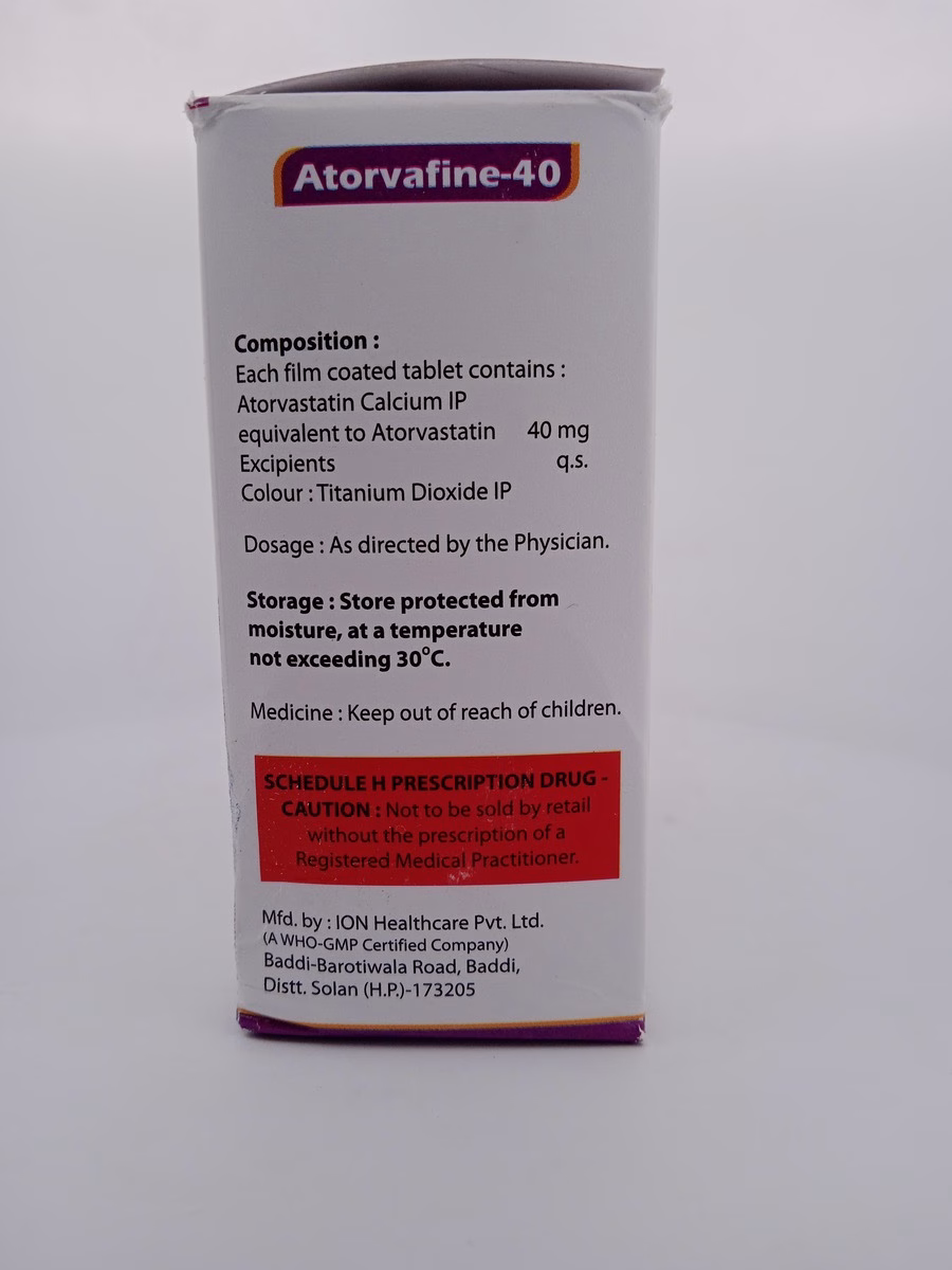 Q: Are there any side effects associated with Atorvafine 40mg? A: Common side effects may include muscle pain, nausea, diarrhea, and headache. Contact your doctor if you experience any severe or persistent side effects.