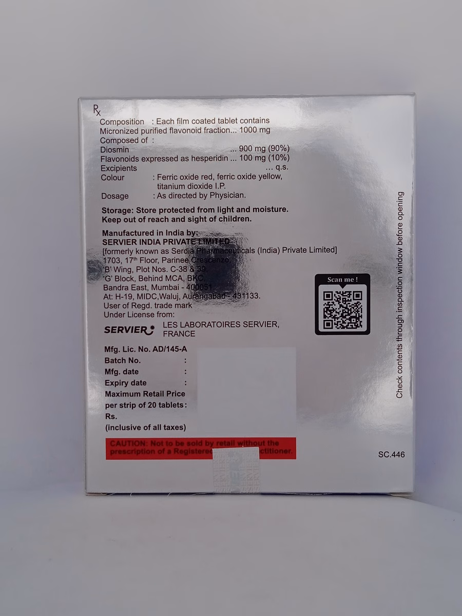 DAFLON 1000 MG contains a combination of Diosmin and Hesperidin, two flavonoids that improve venous circulation and reduce inflammation. It is widely used for the treatment of varicose veins by strengthening vein walls, reducing swelling, and alleviating leg pain. DAFLON 1000 MG is also effective in managing the symptoms of hemorrhoids, such as bleeding, itching, and discomfort, by enhancing blood flow and reducing venous stasis.