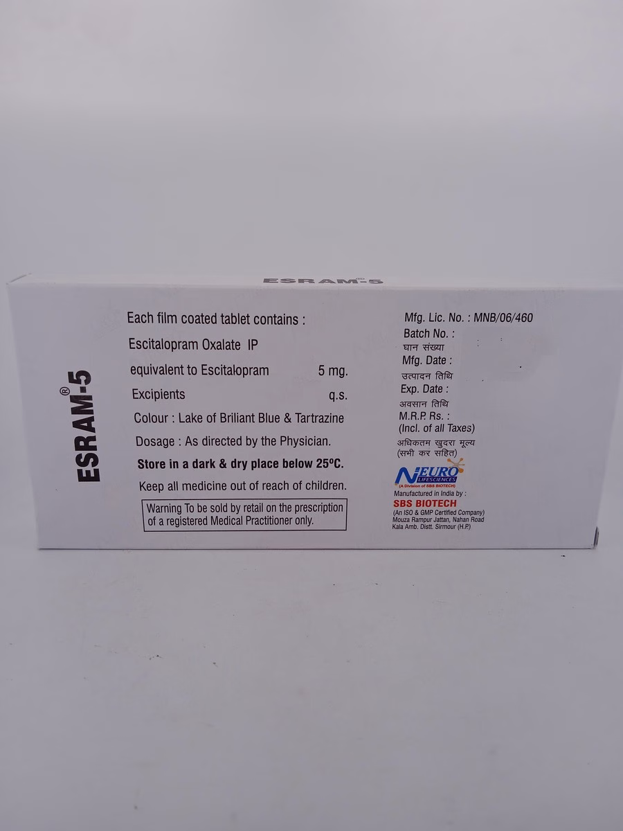 ESRAM 5 MG contains escitalopram, an SSRI that works by increasing serotonin levels in the brain, a neurotransmitter crucial for mood regulation. This medication effectively alleviates symptoms of depression, anxiety disorders, and panic attacks, promoting emotional stability and enhancing quality of life.