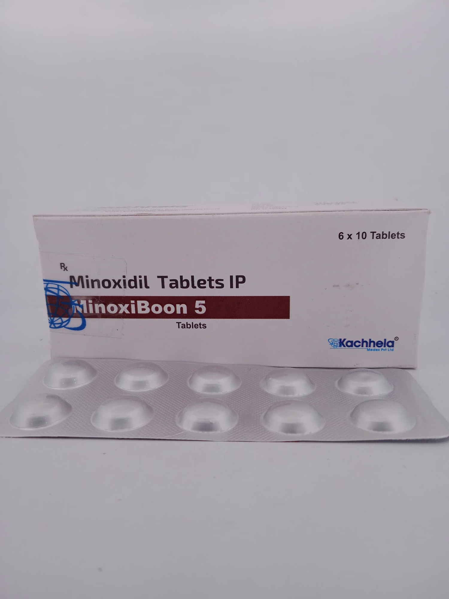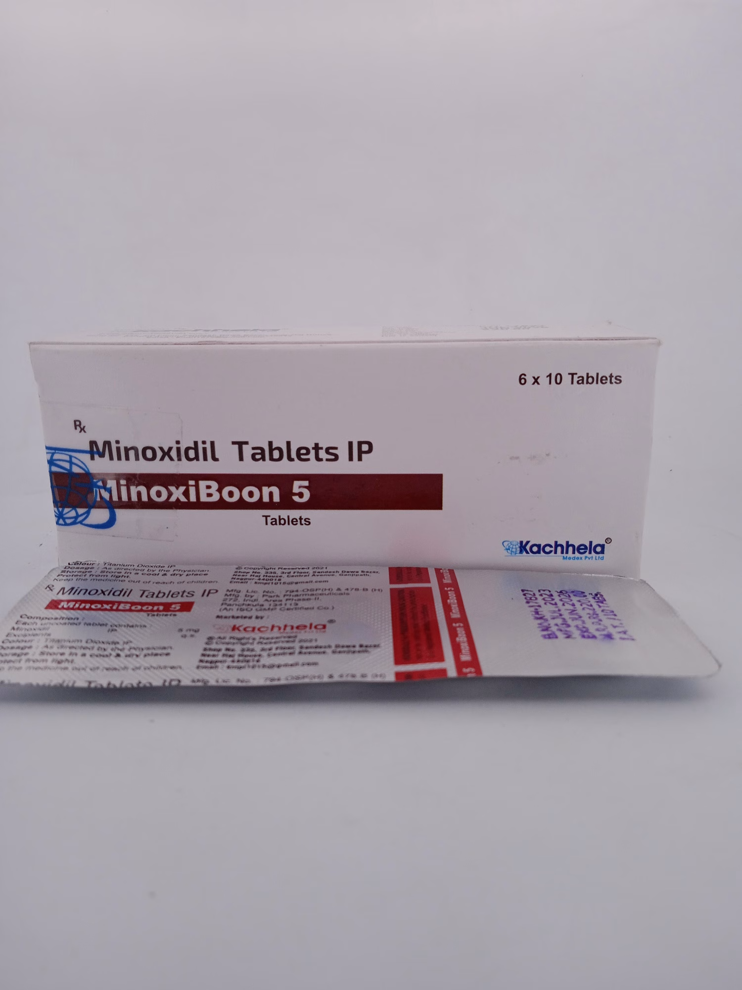 Mechanism of Action: MINOXIBOON 5mg works by widening blood vessels in the scalp, increasing blood flow to hair follicles, and prolonging the hair growth phase. This promotes the growth of thicker, healthier hair over time.