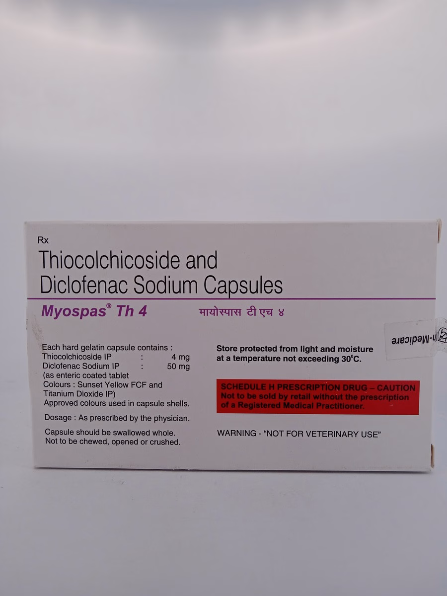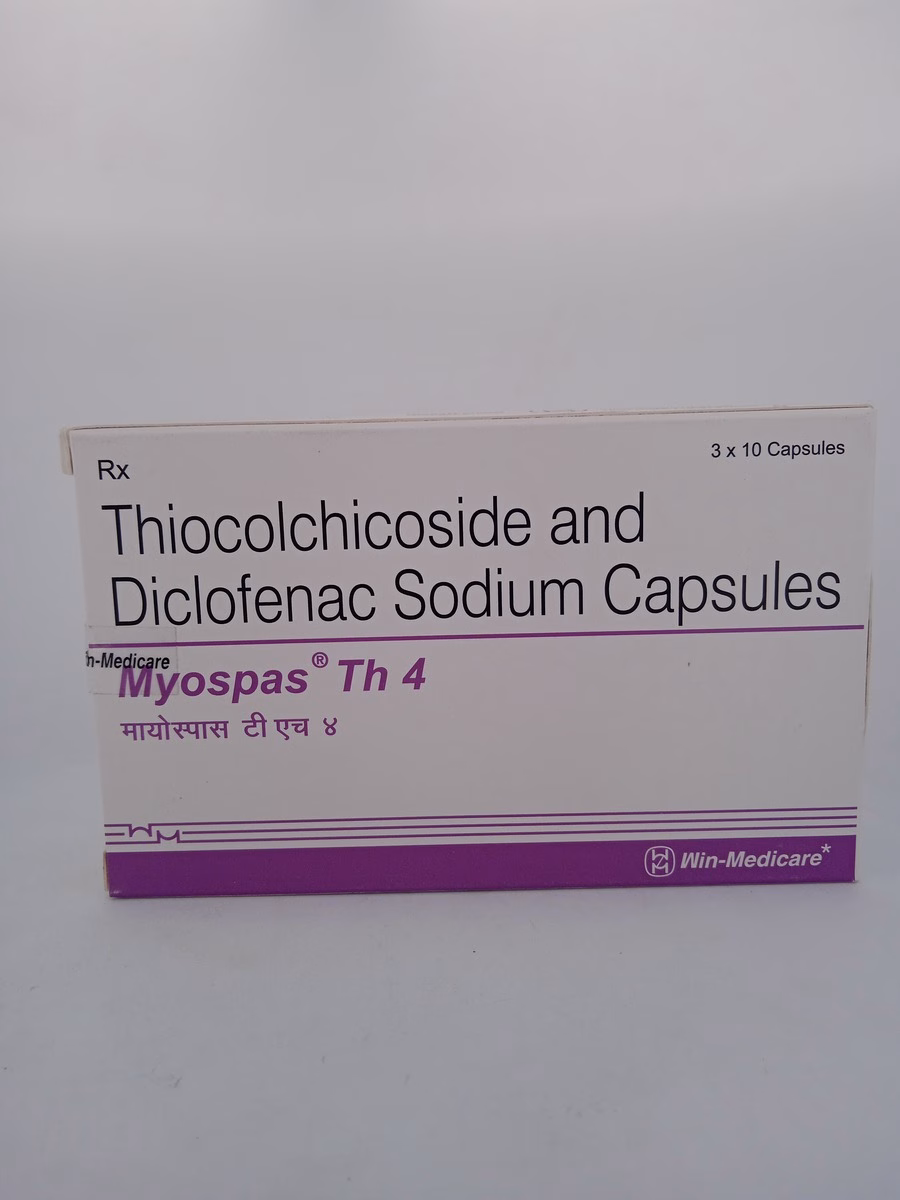 MYOSPAS TH 4 contains Thiocolchicoside, a muscle relaxant that helps reduce muscle stiffness and spasms, and Diclofenac, a non-steroidal anti-inflammatory drug (NSAID) that reduces pain and inflammation. This dual-action formula is highly effective in treating musculoskeletal conditions, offering relief from pain and improving mobility. It is commonly used for back pain, neck pain, and injuries caused by physical strain.