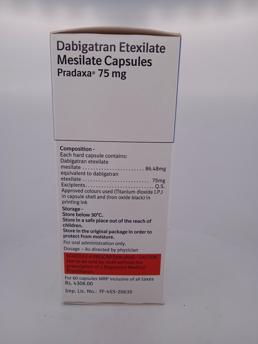 PRADAXA 75 MG Capsule contains dabigatran etexilate, a direct thrombin inhibitor that prevents blood clot formation by directly interfering with thrombin’s action. This medication is essential for reducing the risk of stroke and heart attack in patients with certain conditions. It helps manage clotting disorders by preventing clots in veins and arteries, ensuring better cardiovascular health and reducing complications associated with blood clots.