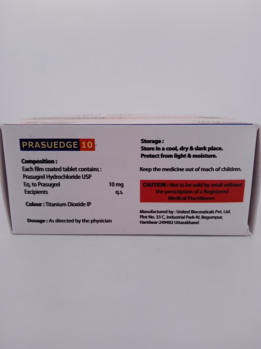 PRASUEDGE 10MG, containing Prasugrel 10mg, is a potent antiplatelet medication designed to prevent blood clots, reducing the risk of heart attack and stroke. Its advanced formula ensures rapid action and sustained efficacy for optimal cardiovascular protection.