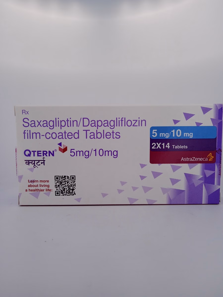 QTERN 5MG/10MG combines Dapagliflozin (5 mg) and Saxagliptin (10 mg) in a single tablet. Dapagliflozin, an SGLT2 inhibitor, works by reducing glucose reabsorption in the kidneys, increasing glucose excretion in urine. Saxagliptin, a DPP-4 inhibitor, enhances insulin release and decreases glucose production by the liver. Together, they provide a comprehensive approach to managing blood glucose levels in type 2 diabetes. The extended-release formulation ensures sustained therapeutic effects with once-daily administration.