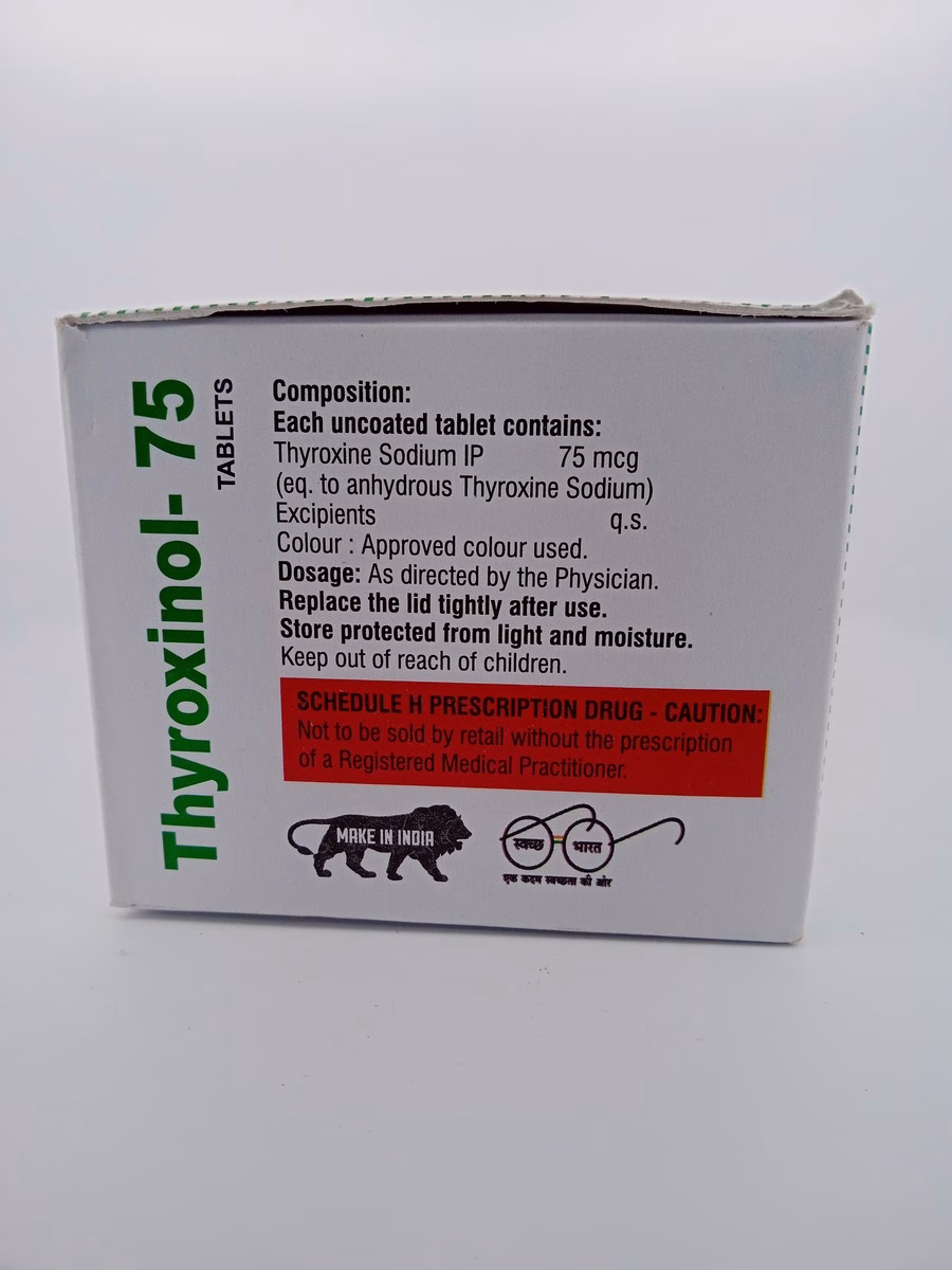 Storage Conditions: Store Thyroxinol 75mg in a cool, dry place away from direct sunlight. Keep the bottle tightly closed and out of reach of children to maintain its quality and potency.