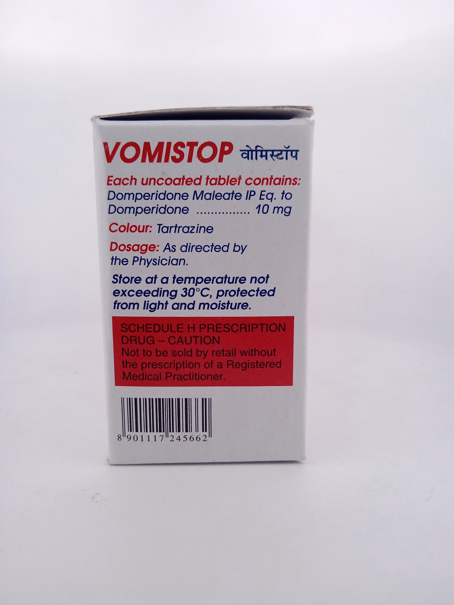 VOMISTOP 10mg Tablets contain Domperidone, a proven antiemetic and prokinetic agent. Domperidone works by blocking dopamine receptors in the brain and upper digestive tract, enhancing gastric motility and preventing reflux. This mechanism alleviates symptoms such as nausea, vomiting, bloating, and indigestion, restoring digestive comfort and function.